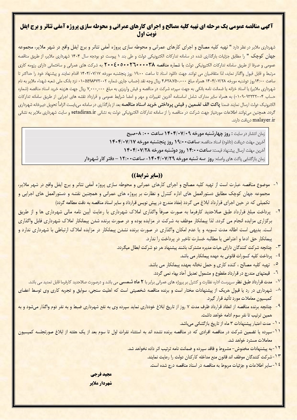 آگهی مناقصه عمومی یک مرحله ای تهیه کلیه مصالح و اجرای کارهای عمرانی و محوطه سازی پروژه آمفی تئاتر و برج ایفل نوبت اول