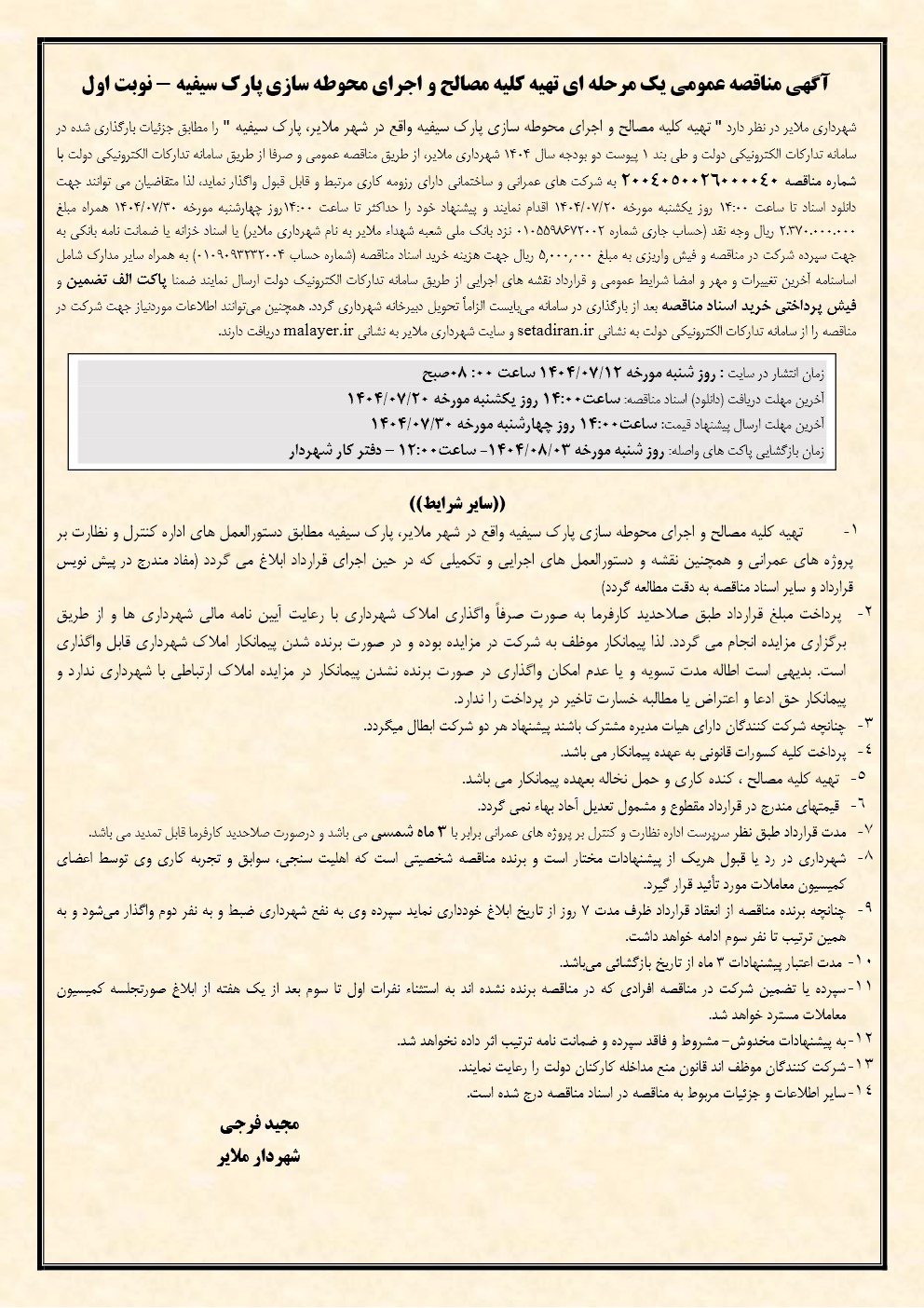 آگهی مناقصه عمومی یک مرحله ای تهیه کلیه مصالح و اجرای محوطه سازی پارک سیفیه - نوبت اول
